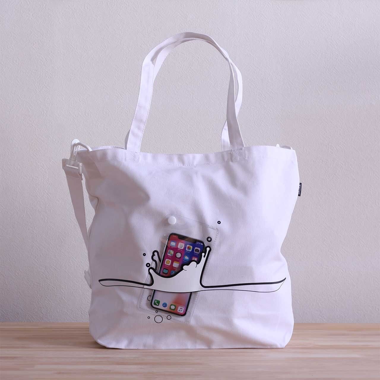 バッグに印刷された「水しぶき」のデザインには透明ポケットがついていて、ポケットに小物を入れるとまるでアイテムが水に落ちたように見えます。